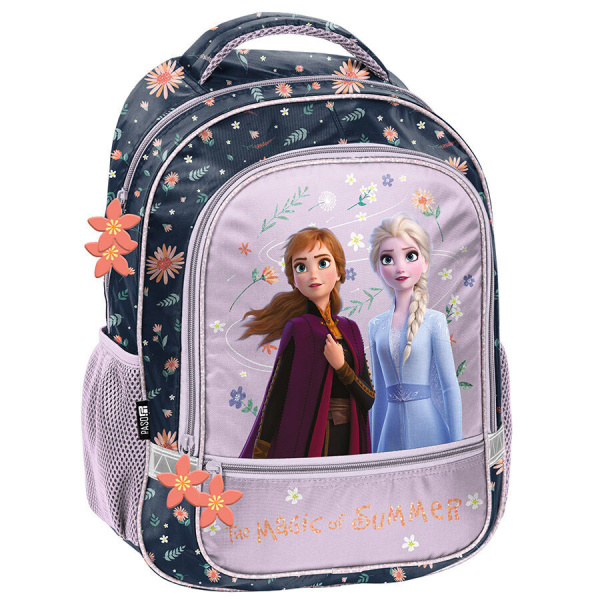 Tornister szkolny Kraina lodu charakteryzuje się jedną obszerną komorą, która jest zapinana na dwukierunkowy zamek, wyposażony w ozdobne pullery ułatwiające