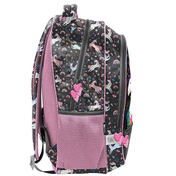 Plecak szkolny Bambi dwukomorowy z obszerną kieszenią z przodu. Plecak wyposażony w dwie boczne kieszenie z siatki, które swobodnie pomieszczą