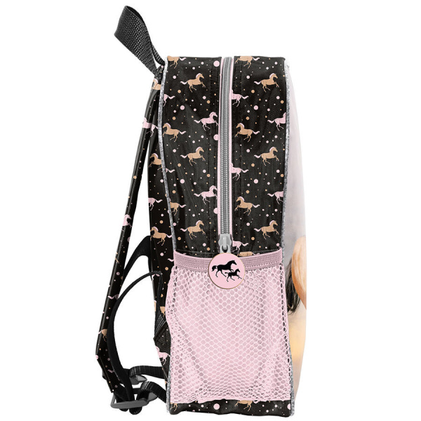 Plecak przedszkolny Lovely horses. Stanowi idealne rozwiązanie dla dzieci uczęszczających do przedszkola lub klasy zerowej. Plecak wyposażony jest w jedną komorę oraz praktyczną kieszeń na przedniej części. Posiada lekko usztywnione plecy, uchwyt do przenoszenia oraz regulowane, wyściełane szelki. Dodatkowo, dwie boczne kieszenie z siatki umożliwiają przechowywanie bidonu, małej butelki lub termosu.
