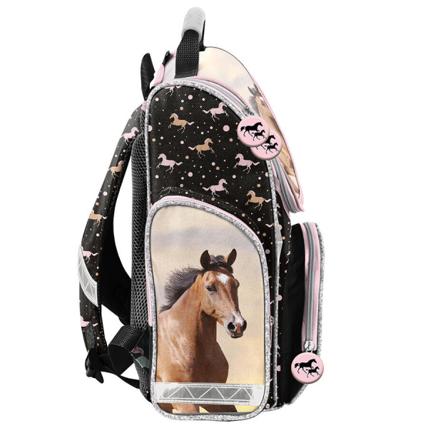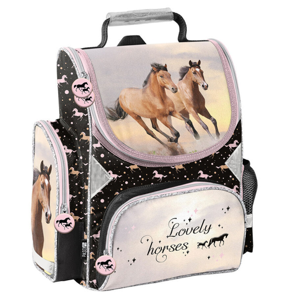 Tornister szkolny Lovely horses. Posiada jedną obszerną komorę, zapinaną na zamek dwukierunkowy z ozdobnymi pullerami ułatwiającymi zamykanie. Wewnątrz znajdują się