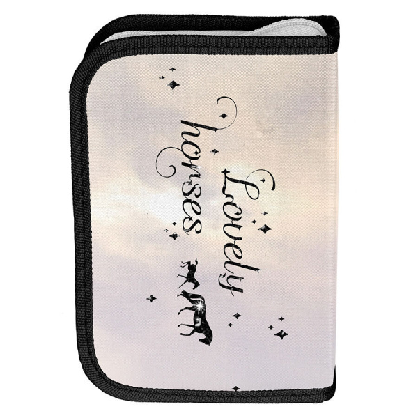 Piórnik wyposażony w motywy Lovely horses to produkt o uniwersalnym charakterze, charakteryzujący się jednokomorową konstrukcją z dwiema klapkami na przybory,