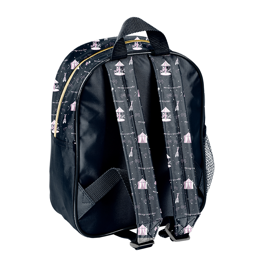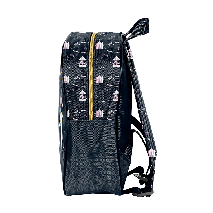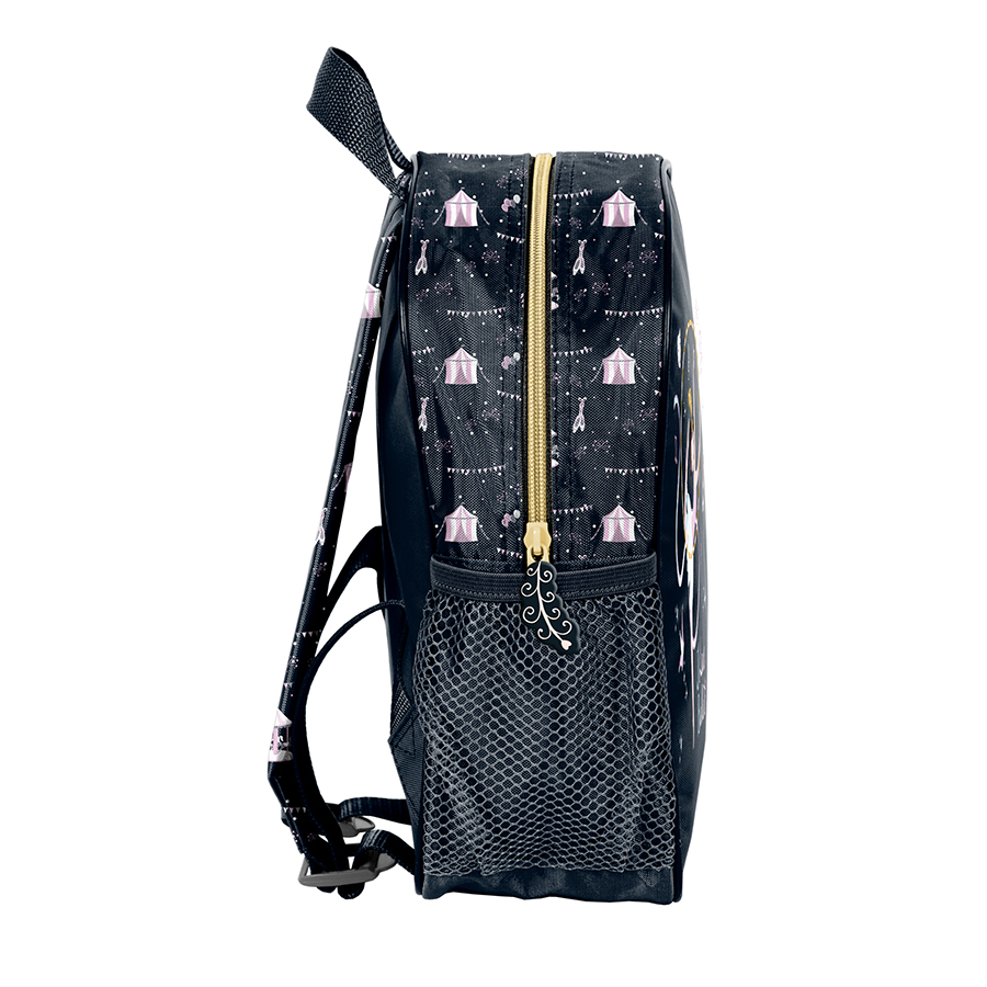 Mały plecak przedszkolny Ballerina. Posiada jedną komorę oraz boczną kieszonkę wykonaną z siatki, w której można przechować małą butelkę, bidon lub termos. Plecak wyposażony jest w regulowane szelki, dzięki którym można idealnie dostosować plecak do wzrostu dziecka. Plecak ma wygodny uchwyt do przenoszenia oraz ozdobne pullery. Idealny dla młodszych dzieci, na szkolną wycieczkę, zajęcia pozalekcyjne czy do przedszkola.