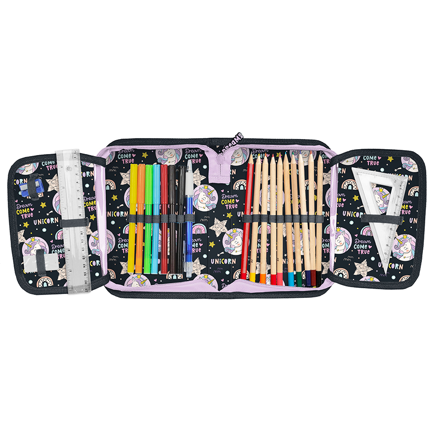 Piórnik z wyposażeniem Jednorożec. Uniwersalny, jednokomorowy model z dwiema klapkami na przybory, zapinany na zamek błyskawiczny. Piórnik bez trudu pomieści najważniejsze szkolne akcesoria. Wzbogacony o wyposażenie w postaci przyborów takich jak (długopis, ołówek, 7 pisaków, 9 kredek, gumka, linijka, temperówka, ekierka). Znajdujące się wewnątrz uchwyty pozwalają zachować idealny porządek.