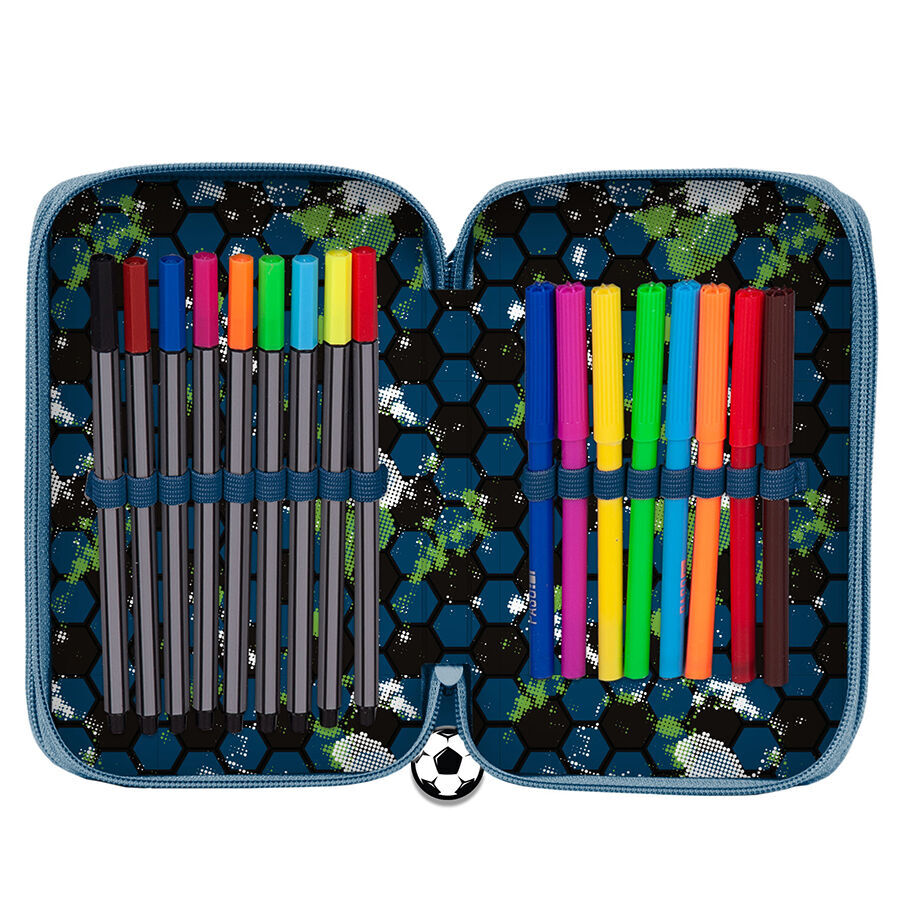 Piórnik z wyposażeniem Football. Uniwersalny, trzykomorowy model z przyborami, zapinany na zamek błyskawiczny. Piórnik bez trudu pomieści najważniejsze szkolne akcesoria. Wzbogacony o wyposażenie w postaci przyborów takich jak (2 długopisy, 2 ołówki, 9 cienkopisów, 8 pisaków, 18 kredek, gumka, linijka, temperówka, ekierka, kątomierz i plan lekcji). Znajdujące się wewnątrz uchwyty pozwalają zachować idealny porządek.