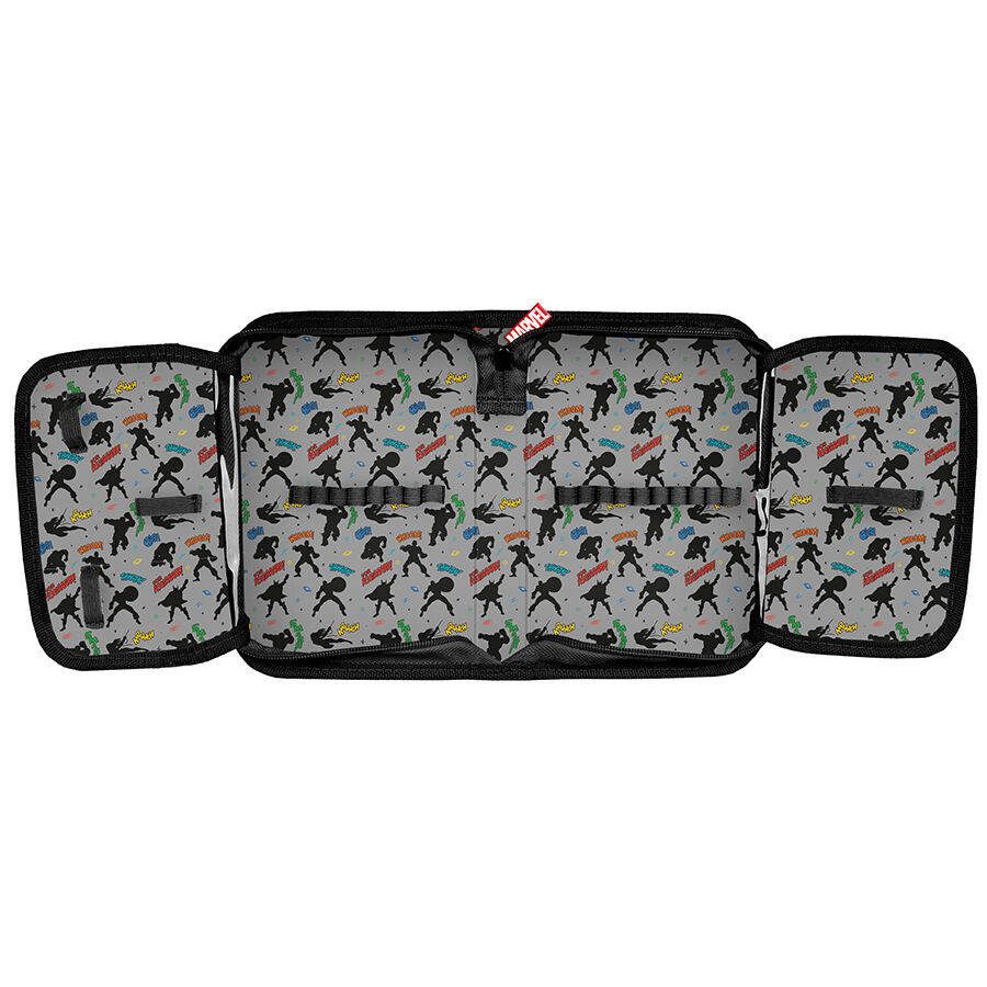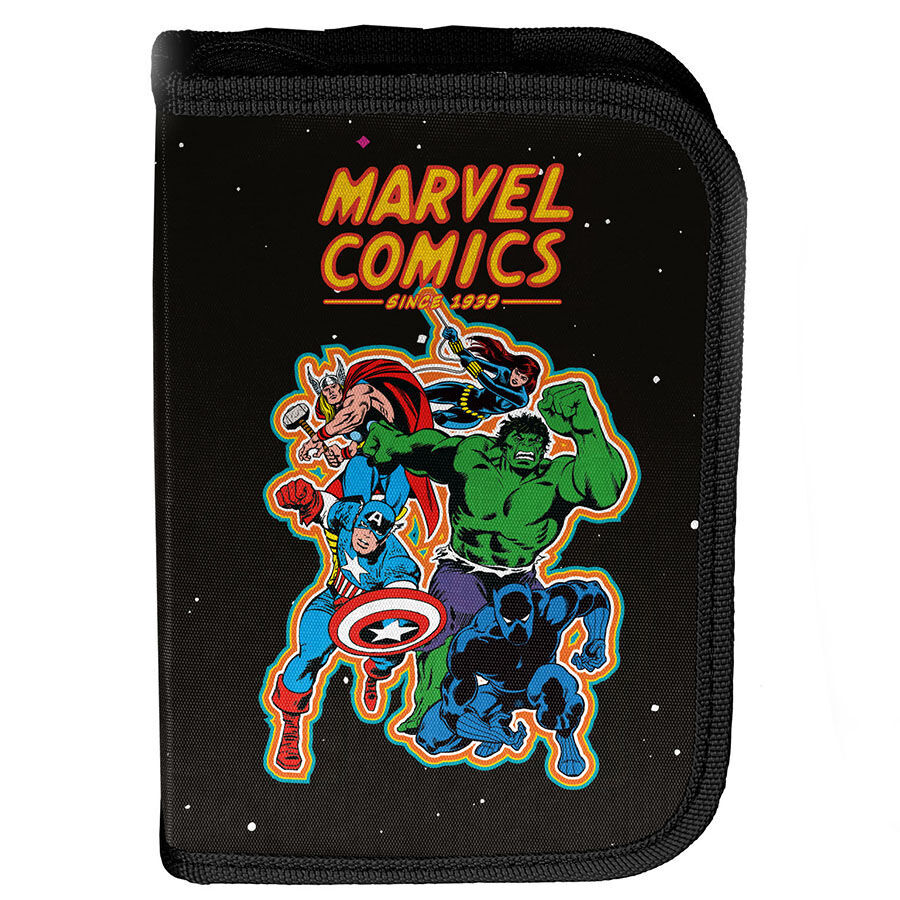 Piórnik bez wyposażenia Avengers Comics Marvel. Uniwersalny, jednokomorowy model z dwiema klapkami na przybory, zapinany na zamek błyskawiczny. Piórnik bez trudu pomieści najważniejsze szkolne akcesoria, a znajdujące się wewnątrz uchwyty pozwolą zachować idealny porządek wśród przyborów. Dzięki swim idealnym wymiarom nie zajmuje dużo miejsca w plecaku szkolnym.