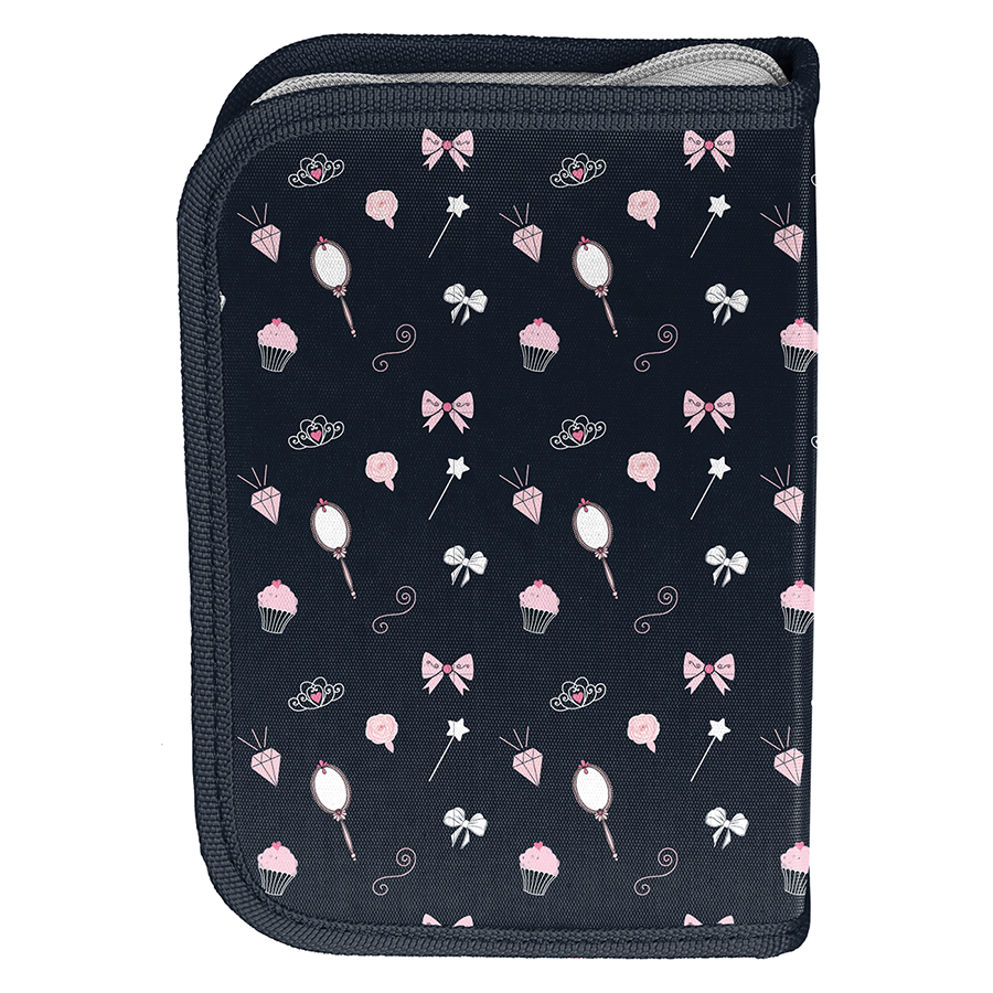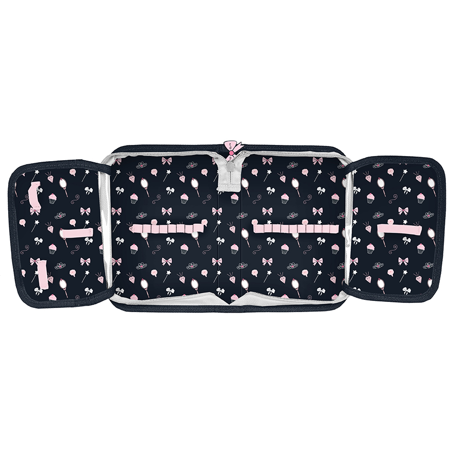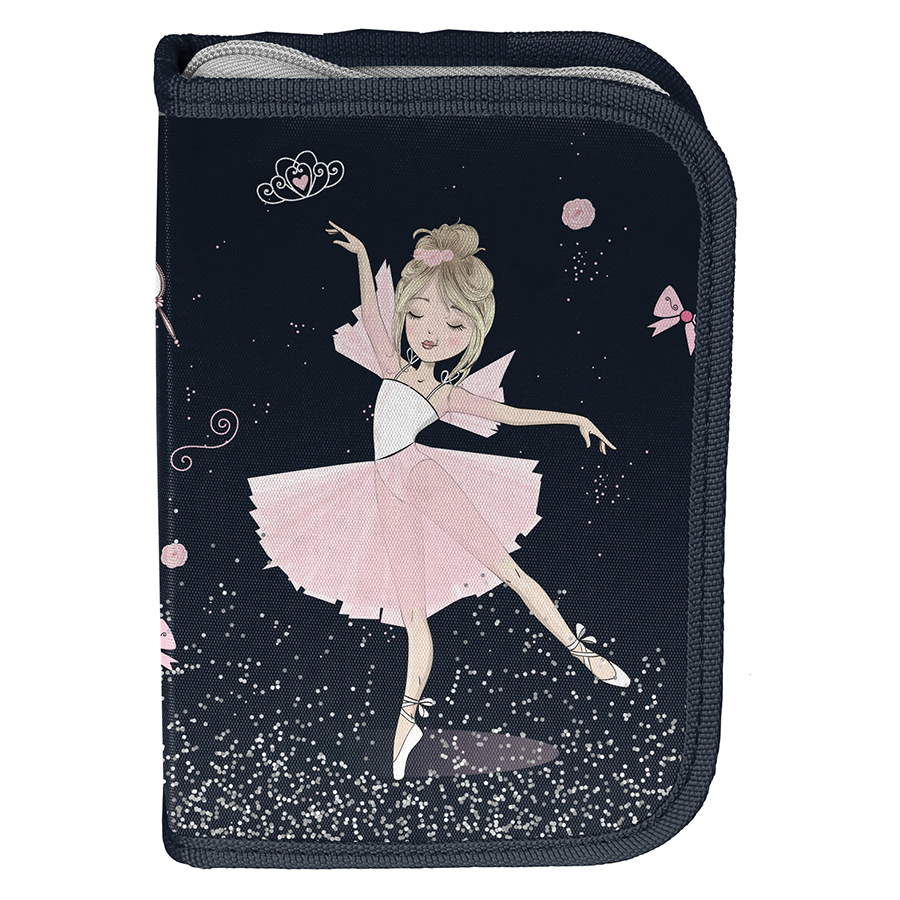 Piórnik bez wyposażenia Baletnica. Uniwersalny, jednokomorowy model z dwiema klapkami na przybory, zapinany na zamek błyskawiczny. Piórnik bez trudu pomieści najważniejsze szkolne akcesoria, a znajdujące się wewnątrz uchwyty pozwolą zachować idealny porządek wśród przyborów. Dzięki swim idealnym wymiarom nie zajmuje dużo miejsca w plecaku szkolnym.