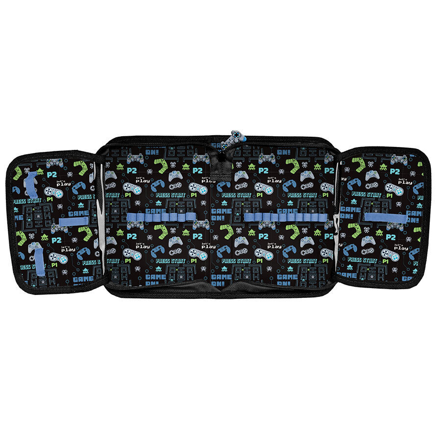 Piórnik Game on! Pad w wersji bez wyposażenia to uniwersalny model jednokomorowy, który wyposażono w dwie praktyczne klapki na przybory, zamykane na zamek błyskawiczny. Dzięki swojej pojemności bez trudu pomieści najważniejsze akcesoria szkolne, a wewnętrzne uchwyty zapewnią doskonały porządek wśród przyborów. Jego optymalne wymiary sprawiają, że nie zajmuje dużo miejsca w plecaku szkolnym.