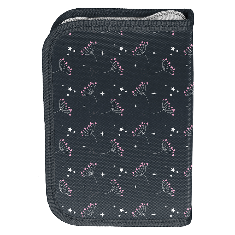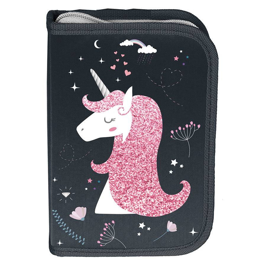 Piórnik bez wyposażenia Jednorożec. Uniwersalny, jednokomorowy model z dwiema klapkami na przybory, zapinany na zamek błyskawiczny. Piórnik bez trudu pomieści najważniejsze szkolne akcesoria, a znajdujące się wewnątrz uchwyty pozwolą zachować idealny porządek wśród przyborów. Dzięki swim idealnym wymiarom nie zajmuje dużo miejsca w plecaku szkolnym.