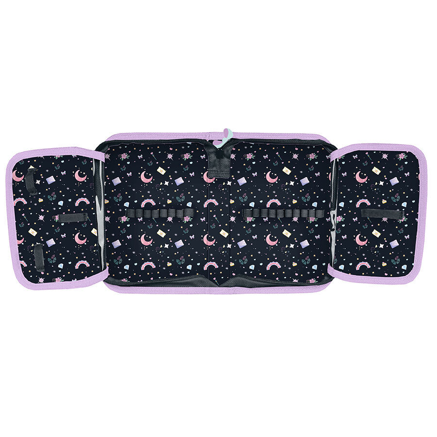 Piórnik Magic Unicorn bez wyposażenia to uniwersalny, jednokomorowy model, wyposażony w dwie klapki na przybory, zapinany na niezawodny zamek błyskawiczny. Jego przestronna konstrukcja pomieści wszystkie niezbędne akcesoria szkolne, a wewnętrzne uchwyty pomogą utrzymać porządek wśród przyborów. Dzięki optymalnym wymiarom piórnik nie zajmuje dużo miejsca w plecaku szkolnym.