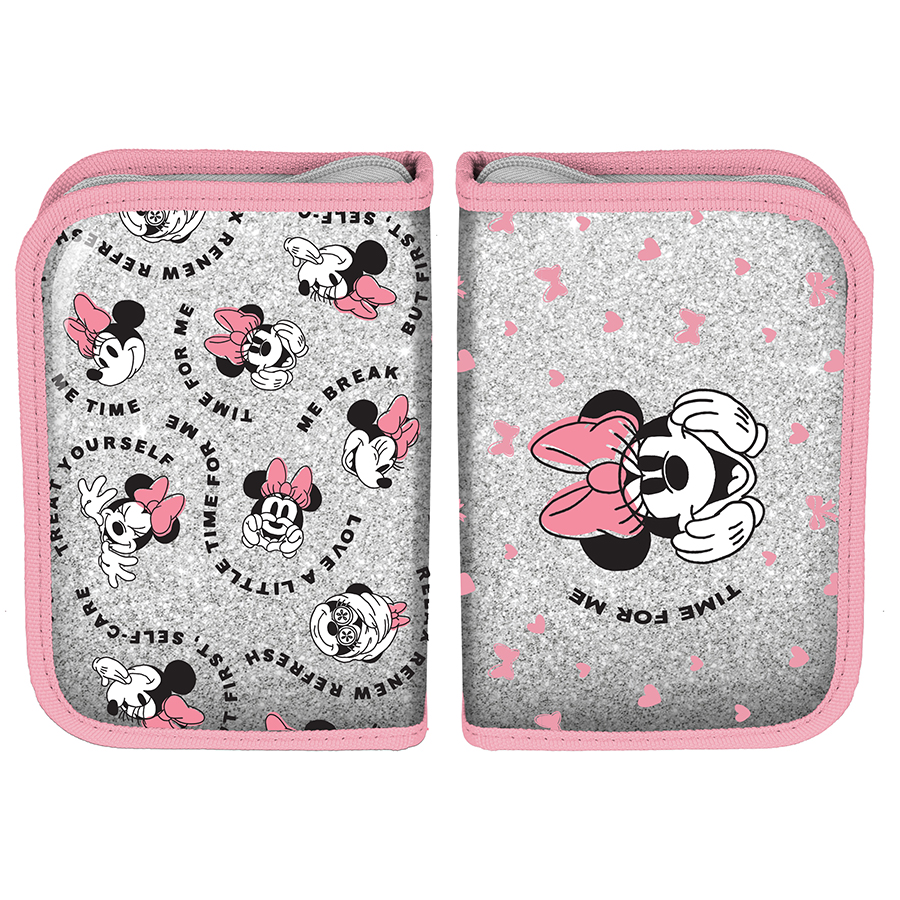 Piórnik bez wyposażenia Minnie. Uniwersalny, jednokomorowy model z dwiema klapkami na przybory, zapinany na zamek błyskawiczny. Piórnik bez trudu pomieści najważniejsze szkolne akcesoria, a znajdujące się wewnątrz uchwyty pozwalają zachować idealny porządek wśród przyborów.