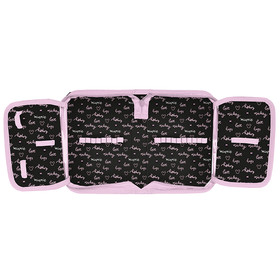 Piórnik z wyposażeniem Minnie. Uniwersalny, trzykomorowy model z przyborami, zapinany na zamek błyskawiczny. Piórnik bez trudu pomieści najważniejsze szkolne akcesoria.