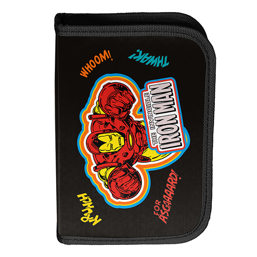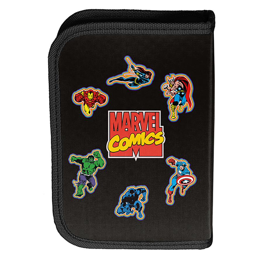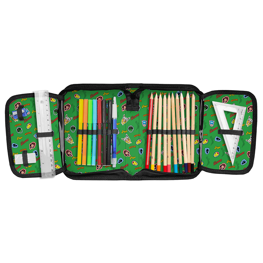 Piórnik z wyposażeniem Avengers. Uniwersalny, jednokomorowy model z dwiema klapkami na przybory, zapinany na zamek błyskawiczny. Piórnik bez trudu pomieści najważniejsze szkolne akcesoria. Wzbogacony o wyposażenie w postaci przyborów takich jak (długopis, ołówek, 7 pisaków, 9 kredek, gumka, linijka, temperówka, ekierka). Znajdujące się wewnątrz uchwyty pozwalają zachować idealny porządek.