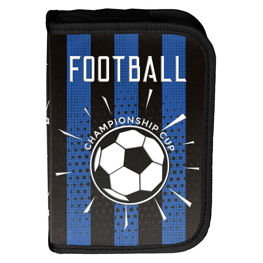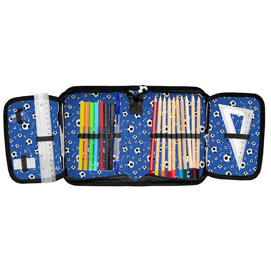Piórnik z wyposażeniem w motywach Championship cup football jest produktem o uniwersalnym zastosowaniu, charakteryzującym się jednokomorową konstrukcją oraz dwiema klapkami na przybory, zamykany na zamek błyskawiczny. Model ten z powodzeniem pomieści najważniejsze akcesoria szkolne. Dodatkowo, został wzbogacony o zestaw przyborów, w tym długopis, ołówek, siedem pisaków, dziewięć kredek, gumkę, linijkę, temperówkę oraz ekierkę. Wewnątrz piórnika znajdują się uchwyty, które umożliwiają zachowanie należytego porządku.