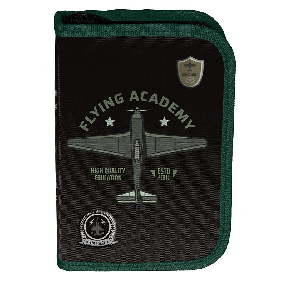 Piórnik bez wyposażenia Flying Academy. Uniwersalny, jednokomorowy model z dwiema klapkami na przybory, zapinany na zamek błyskawiczny. Piórnik bez trudu