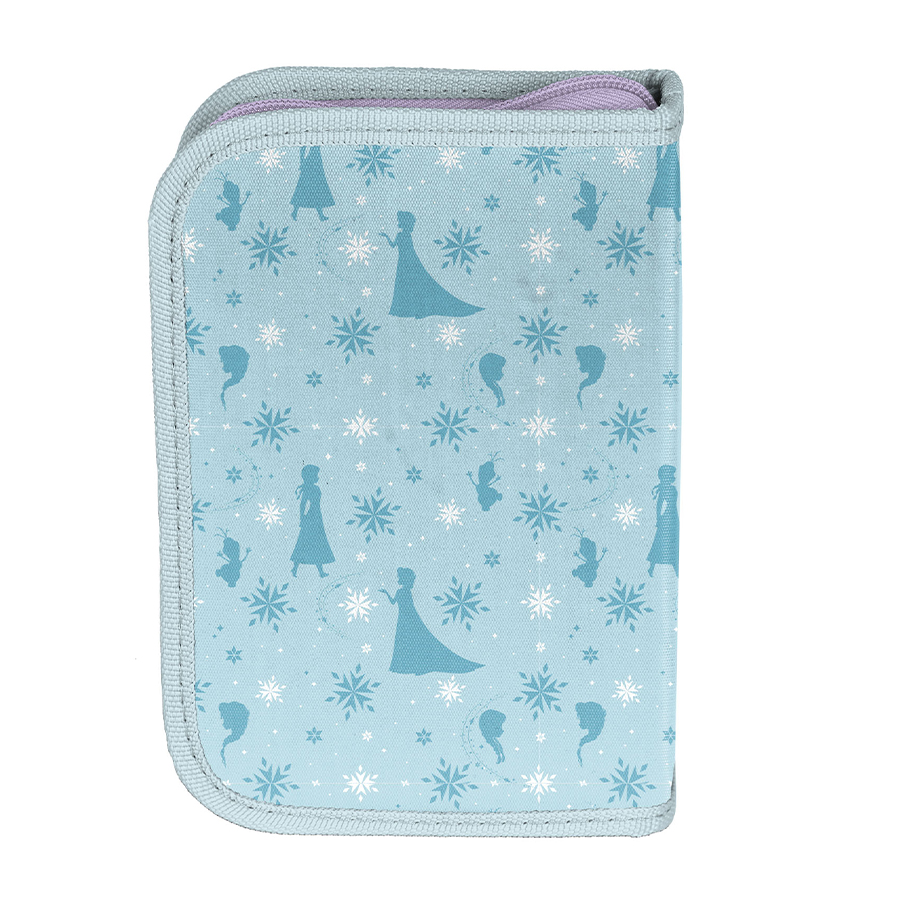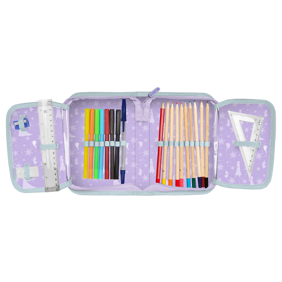 Piórnik z wyposażeniem Frozen. Uniwersalny, jednokomorowy model z dwiema klapkami na przybory, zapinany na zamek błyskawiczny. Piórnik bez trudu pomieści najważniejsze szkolne akcesoria. Wzbogacony o wyposażenie w postaci przyborów takich jak (długopis, ołówek, 7 pisaków, 9 kredek, gumka, linijka, temperówka, ekierka). Znajdujące się wewnątrz uchwyty pozwalają zachować idealny porządek.