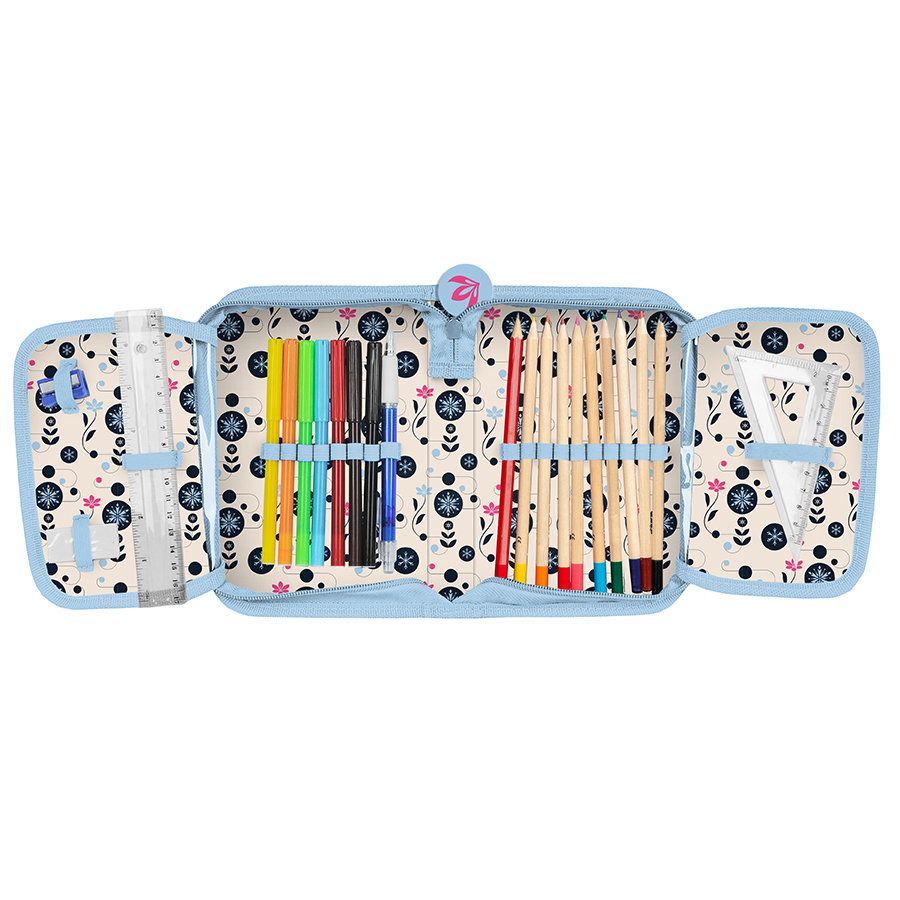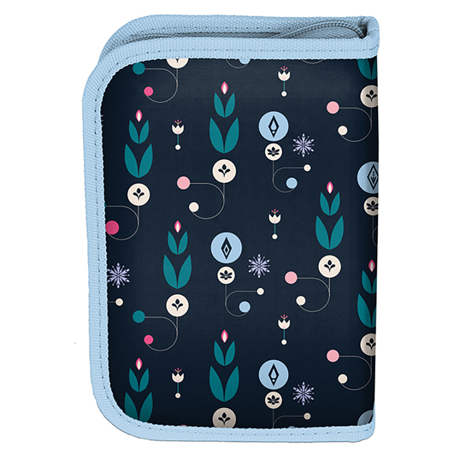 Piórnik z wyposażeniem Frozen. Uniwersalny, jednokomorowy model z dwiema klapkami na przybory, zapinany na zamek błyskawiczny. Piórnik bez trudu pomieści najważniejsze szkolne akcesoria. Wzbogacony o wyposażenie w postaci przyborów takich jak (długopis, ołówek, 7 pisaków, 9 kredek, gumka, linijka, temperówka, ekierka). Znajdujące się wewnątrz uchwyty pozwalają zachować idealny porządek.