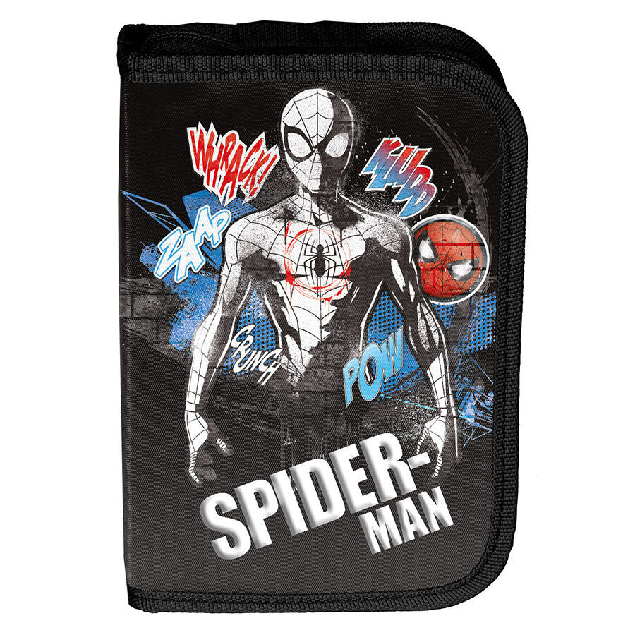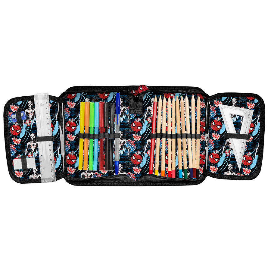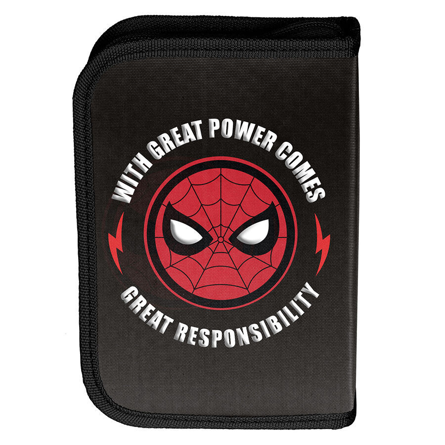 Piórnik wyposażony w motywy Power comes Spider-Man to produkt o uniwersalnym charakterze, charakteryzujący się jednokomorową konstrukcją z dwiema klapkami na przybory, zamykanymi na zamek błyskawiczny. Piórnik z łatwością pomieści najważniejsze akcesoria szkolne. Produkt został wzbogacony o zestaw przyborów, w skład którego wchodzą: długopis, ołówek, siedem pisaków, dziewięć kredek, gumka, linijka, temperówka oraz ekierka. Dodatkowe uchwyty umieszczone wewnątrz piórnika umożliwiają utrzymanie idealnego porządku.