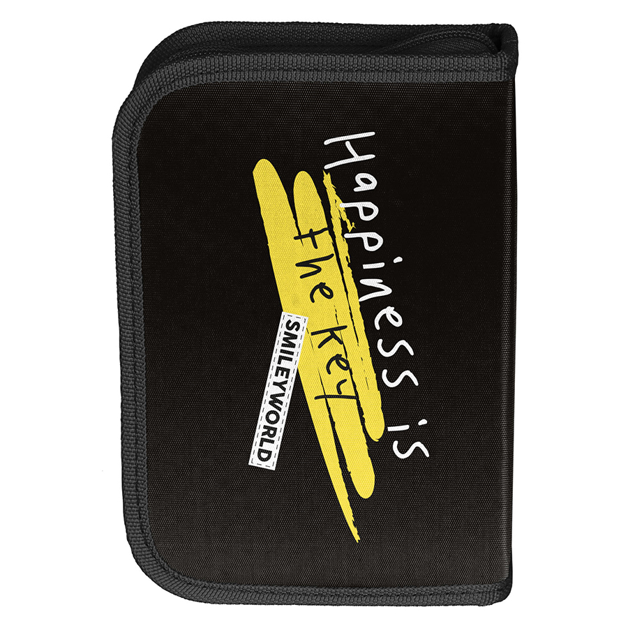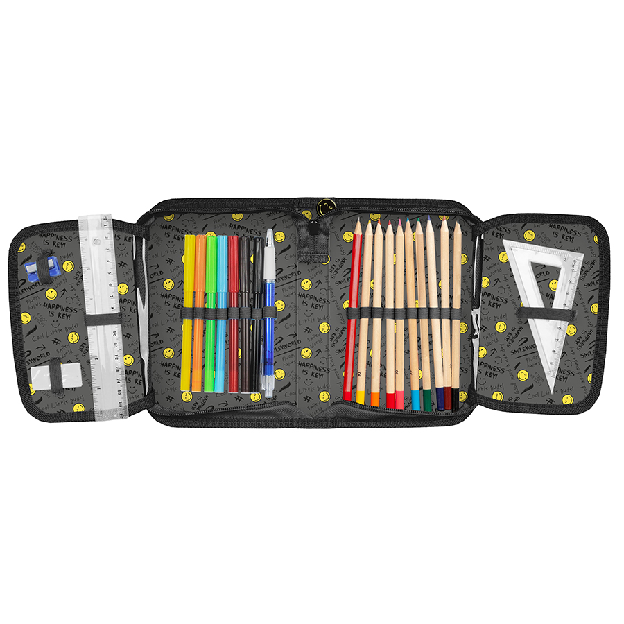 Piórnik z wyposażeniem SmileyWorld. Uniwersalny, jednokomorowy model z dwiema klapkami na przybory, zapinany na zamek błyskawiczny. Piórnik bez trudu pomieści najważniejsze szkolne akcesoria. Wzbogacony o wyposażenie w postaci przyborów takich jak (długopis, ołówek, 7 pisaków, 9 kredek, gumka, linijka, temperówka, ekierka). Znajdujące się wewnątrz uchwyty pozwalają zachować idealny porządek.