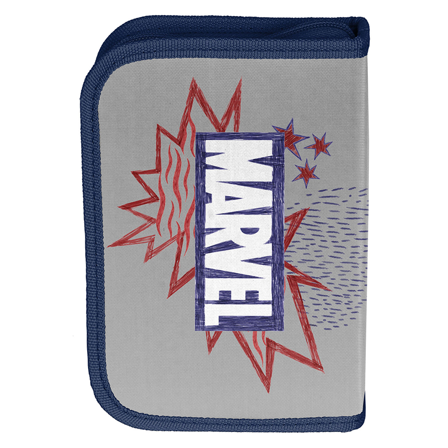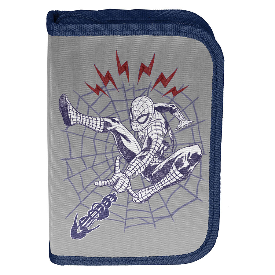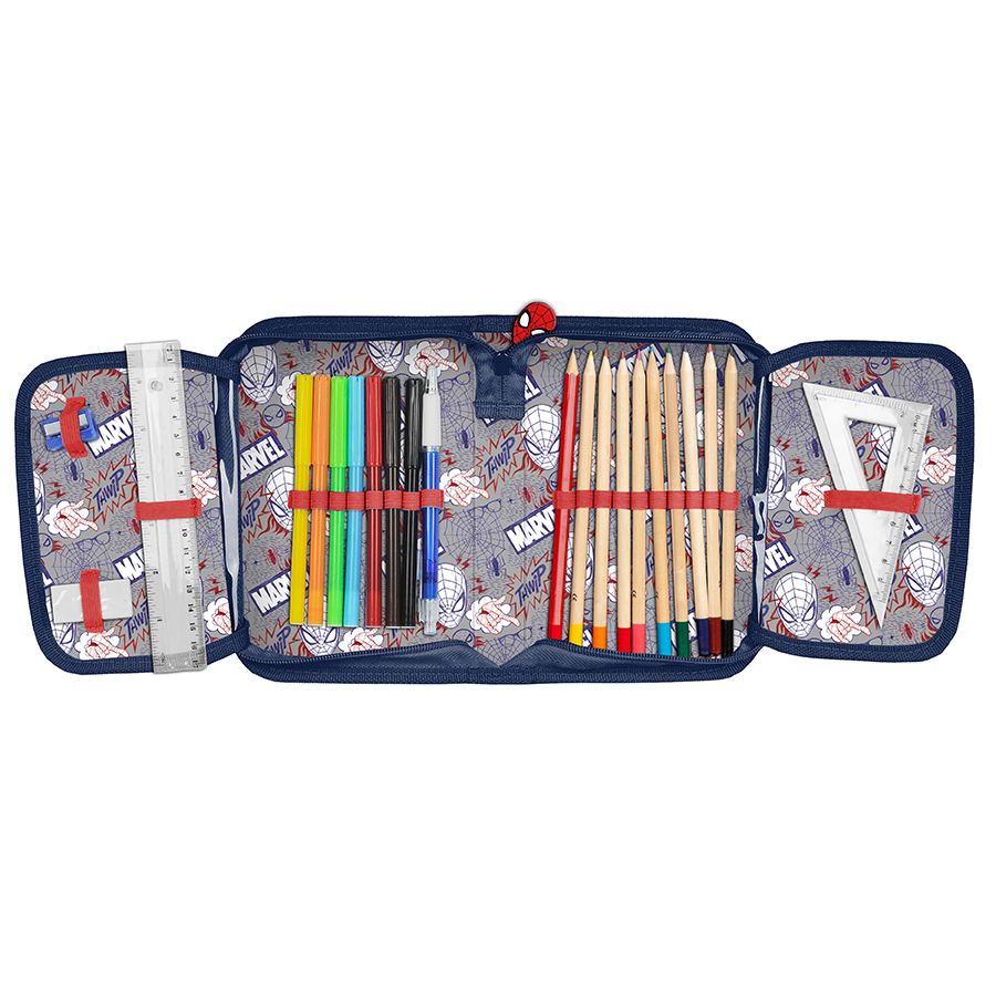 Piórnik z wyposażeniem Spider-Man. Uniwersalny, jednokomorowy model z dwiema klapkami na przybory, zapinany na zamek błyskawiczny. Piórnik bez trudu pomieści najważniejsze szkolne akcesoria. Wzbogacony o wyposażenie w postaci przyborów takich jak (długopis, ołówek, 7 pisaków, 9 kredek, gumka, linijka, temperówka, ekierka). Znajdujące się wewnątrz uchwyty pozwalają zachować idealny porządek.