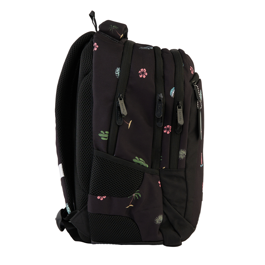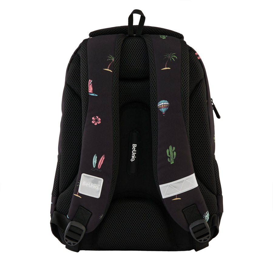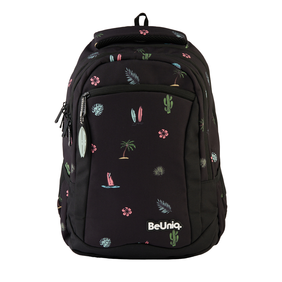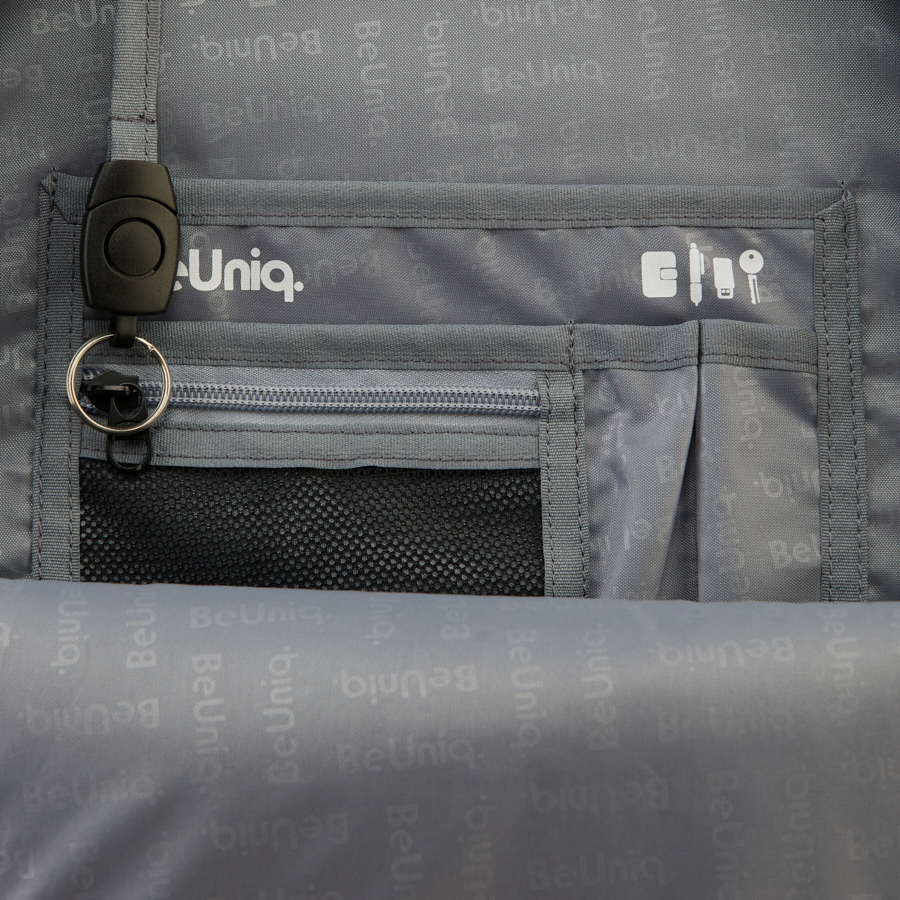Plecak młodzieżowy BeUniq jest wyposażony w trzy pojemne komory, kieszeń przednią z organizerem zamykaną na zamek. Posiada dwie boczne kieszenie z siatki i materiału, które nadają się do przenoszenia butelki, bidonu lub termosu. W komorze głównej znajduje się przegroda – na laptop, w drugiej komorze organizer z kieszenią na zamek oraz uchwyt na klucze. Wzmocnione profilowane plecy oraz miękkie, regulowane szelki sprawiają, że plecak nosi się niezwykle komfortowo. Plecak wykonany jest z materiału odpornego na przemakanie, dzięki czemu model ten doskonale znosi różne warunki atmosferyczne. Posiada wygodny uchwyt do przenoszenia, uszko do powieszenia oraz elementy odblaskowe dla zwiększenia bezpieczeństwa na drodze lub po zmroku.