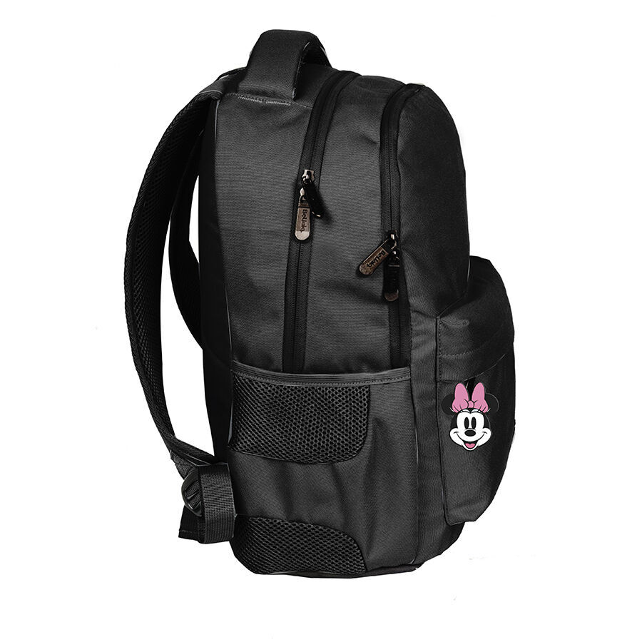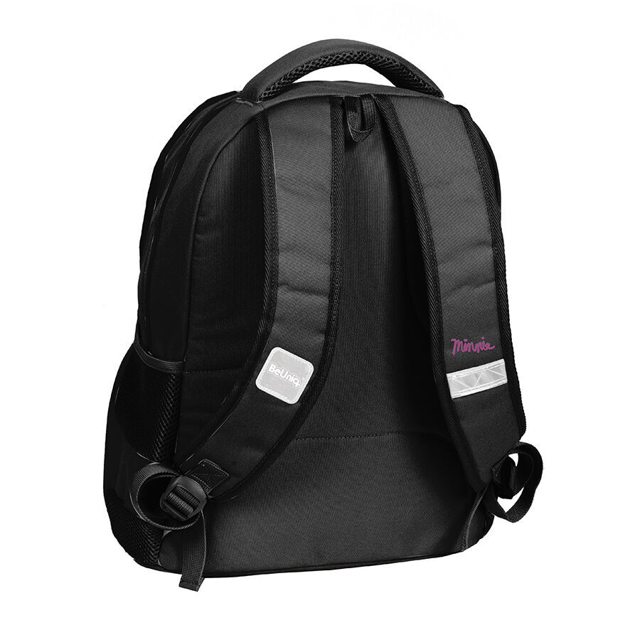 Plecak młodzieżowy Take chances Myszka Minnie BeUniq to połączenie praktyczności i funkcjonalności. Posiada dwie obszerne komory zamykane na zamek, a także dodatkową kieszeń na froncie. Dwie boczne kieszenie z siatki doskonale nadają się na bidon, butelkę czy inne drobiazgi. Warto również zwrócić uwagę na lekko usztywnione plecy oraz regulowane szelki, które doskonale dopasowują się do sylwetki. Zewnętrzna komora została wzbogacona o organizer z przypinką na klucze, a w drugiej komorze umieszczono praktyczną kieszeń na laptopa. Całość wykonana jest z trwałego materiału, dzięki czemu ten lekki model sprawdzi się zarówno w szkole, jak i podczas wycieczek.