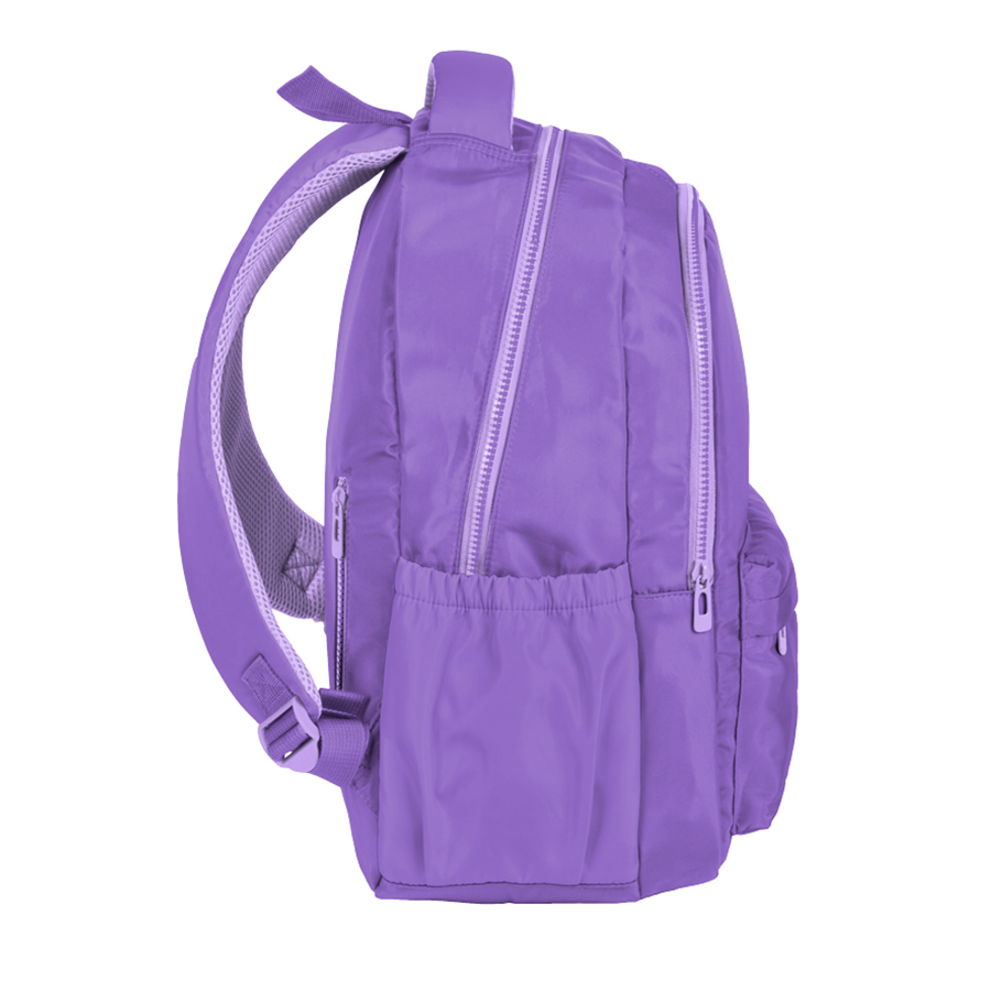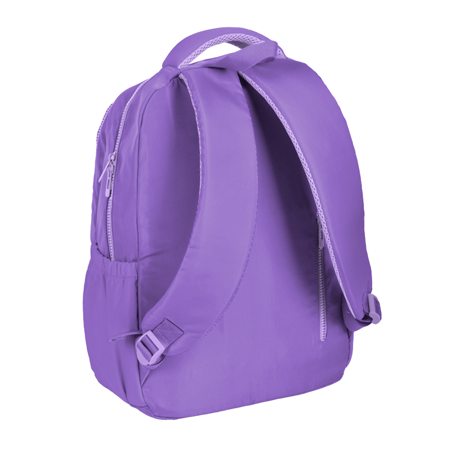 Plecak młodzieżowy BeUniq w kolorze fioletowym charakteryzuje się dwiema funkcjonalnymi komorami, które zamykane są na zamek. Komora główna wyposażona jest w wewnętrzne przegrody, co umożliwia skuteczne utrzymanie porządku. Na przedniej stronie plecaka znajduje się praktyczna kieszeń zamykana na zamek, która pomieści niezbędne drobne akcesoria szkolne. Model ten posiada również dwie boczne kieszonki, które idealnie nadają się do przechowywania bidonu lub butelki z wodą. Miękki, wzmocniony spód oraz regulowane szelki plecaka zwiększają komfort noszenia. Na plecach umieszczona jest dodatkowa, ukryta kieszonka zamykana na zamek, zapewniająca ochronę drobiazgów. Uchwyt górny gwarantuje wygodne przenoszenie plecaka. Całość wykonana jest z lekkiego materiału odpornego na przemakanie, co sprawia, że model ten jest wyjątkowo łatwy do noszenia.