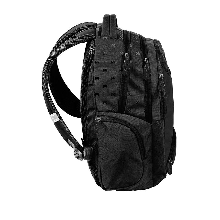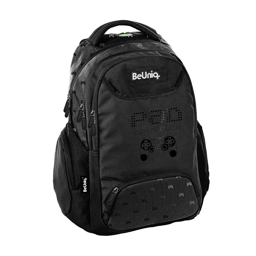Plecak młodzieżowy Game Pads marki BeUniq charakteryzuje się trzema pojemnymi komorami, a także przednią kieszenią z organizerem, zamykaną na zamek błyskawiczny. Dodatkowo, plecak wyposażony jest w dwie boczne kieszenie, które również zamykane są na zamek. W komorze głównej znajduje się przegroda przeznaczona na laptop, natomiast w drugiej komorze umieszczono organizer z kieszenią na zamek oraz uchwyt na klucze.
