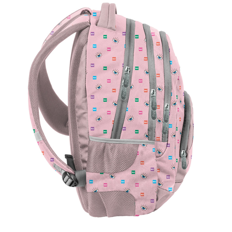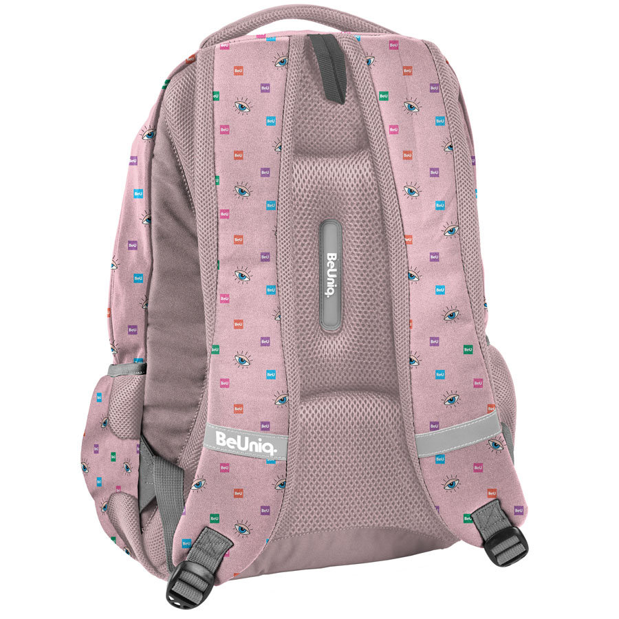 Plecak młodzieżowy BeUniq Pink. Posiada trzy pojemne komory, kieszeń przednią z organizerem zamykaną na zamek oraz dwie boczne kieszonki, wykonane z siatki i materiału, które pomieszczą butelkę, bidon czy termos. W komorze głównej, znajduje się przegroda (na laptop). W drugiej komorze organizer z kieszenią na zamek oraz uchwyt na klucze. Wzmocnione profilowane plecy oraz miękkie, regulowane szelki sprawią, że plecak nosi się niezwykle komfortowo. Plecak posiada wygodny uchwyt do przenoszenia, uszko do powieszenia oraz elementy odblaskowe dla większego bezpieczeństwa na drodze po zmroku. Model zawiera usztywniony i wzmocniony spód. Ze względu na swój rozmiar, plecak ten to idealne rozwiązanie dla nastolatków, jak i dla młodszych dzieci.