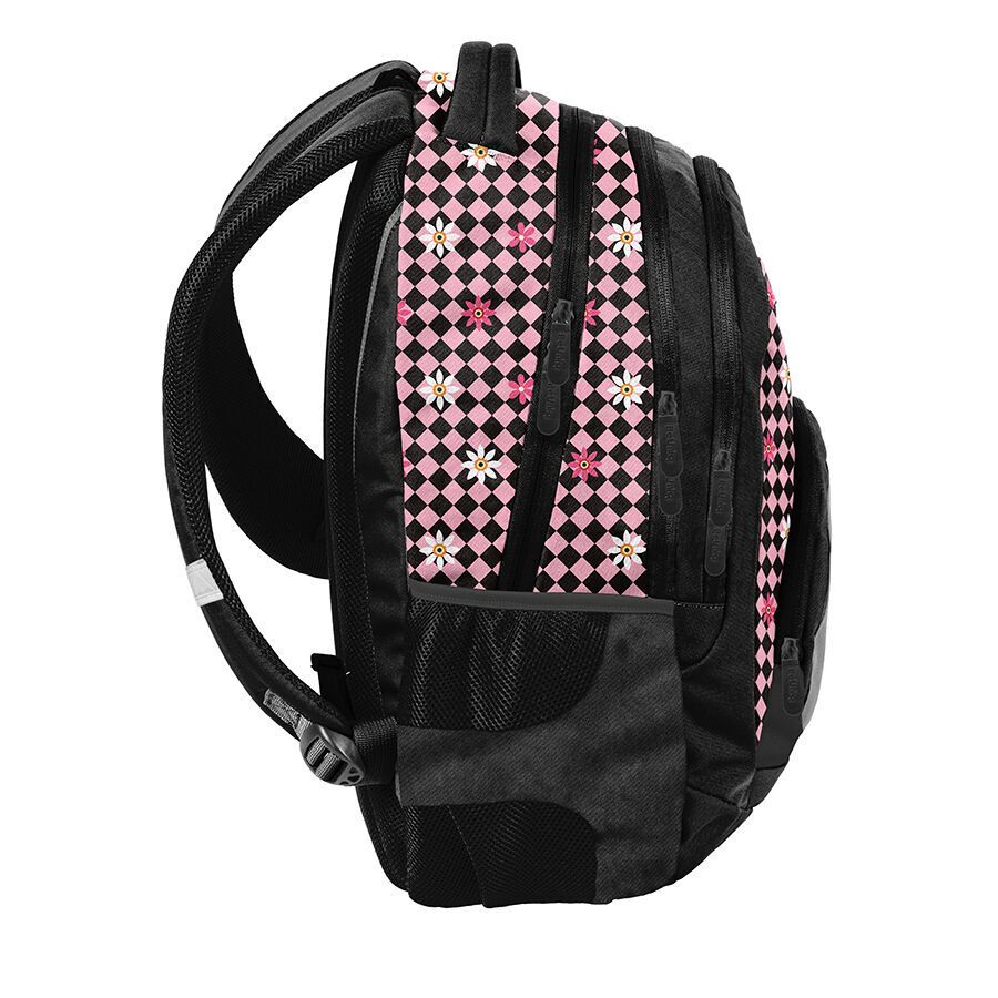 Plecak młodzieżowy Pink floral check BeUniq to doskonały wybór dla każdego młodego ucznia. Wyposażony jest w trzy pojemne komory, co zapewnia wygodną organizację przestrzeni. Z przodu znajduje się kieszeń z organizerem, zamykana na zamek, a po bokach plecaka umieszczono dwie siatkowe kieszonki, idealne na butelkę, bidon lub termos.