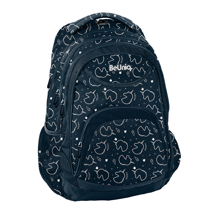 Plecak młodzieżowy Unicorn BeUniq . Posiada trzy pojemne komory, kieszeń przednią z organizerem zamykaną na zamek oraz dwie boczne kieszonki, wykonane z siatki i materiału, które pomieszczą butelkę, bidon czy termos. W komorze głównej, znajduje się przegroda (na laptop). W drugiej komorze organizer z kieszenią na zamek oraz uchwyt na klucze. Wzmocnione profilowane plecy oraz miękkie, regulowane szelki sprawią, że plecak nosi się niezwykle komfortowo. Plecak posiada wygodny uchwyt do przenoszenia, uszko do powieszenia oraz elementy odblaskowe dla większego bezpieczeństwa na drodze po zmroku. Model zawiera usztywniony i wzmocniony spód. Ze względu na swój rozmiar, plecak ten to idealne rozwiązanie dla nastolatków, jak i dla młodszych dzieci.