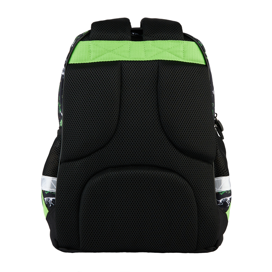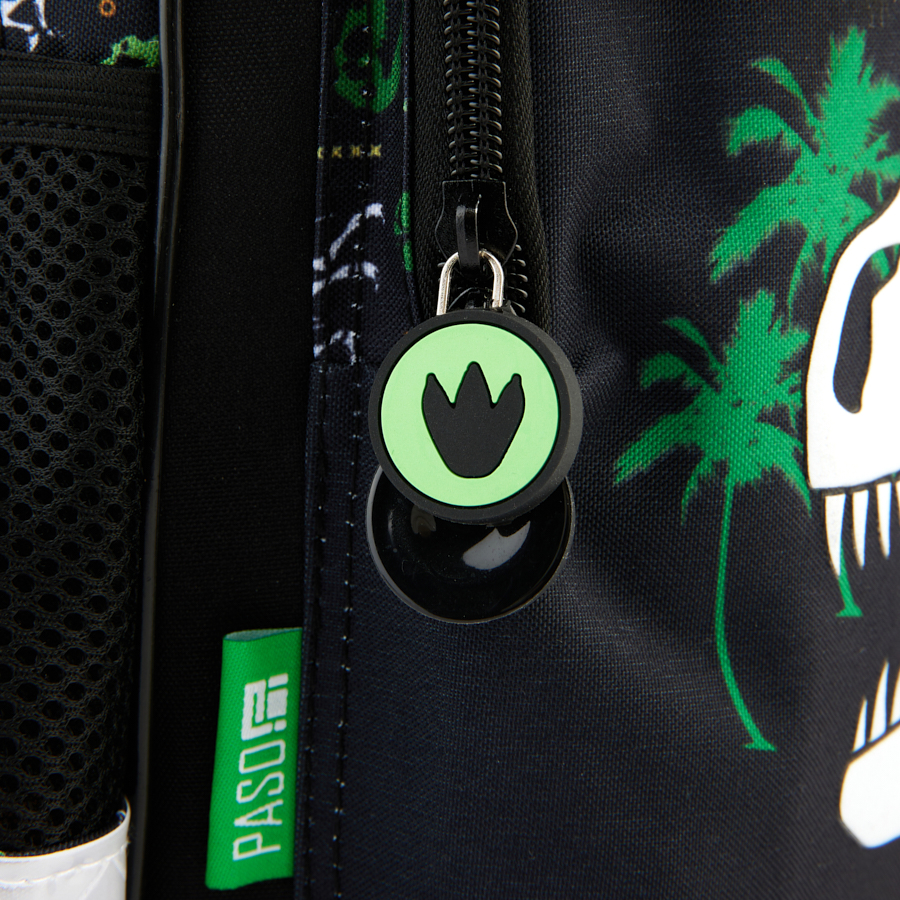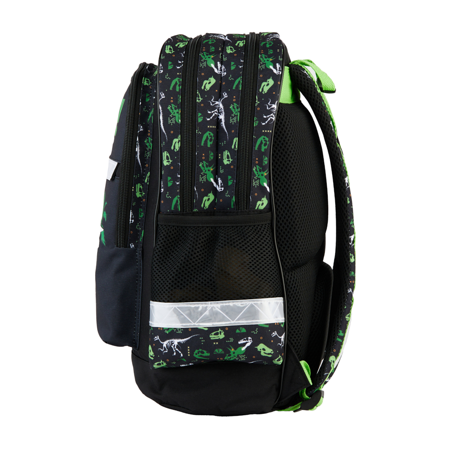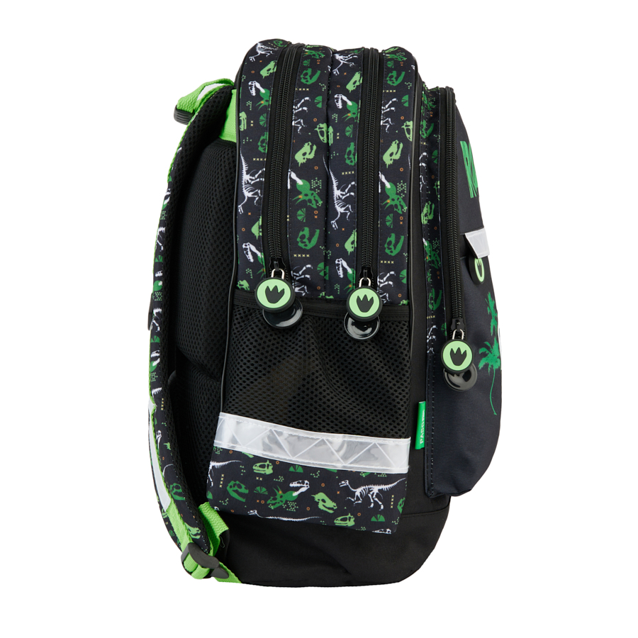 Plecak szkolny Dinozaur. Plecak posiada dwie pojemne komory oraz dwie duże kieszenie frontowe. Dodatkowo jest wyposażony w dwie boczne kieszonki z siatki, które doskonale nadają się do przechowywania drobniejszych akcesoriów lub butelki z napojem. Usztywnione gąbką, ergonomiczne wyprofilowane plecy oraz regulowane szelki pokryte miękkim materiałem zapewniają dziecku prawidłową postawę i odciążają kręgosłup. Plecak wyposażony jest w usztywnione dno, wzmocnione i zabezpieczone gumowymi stopkami. Na froncie, bokach i z tyłu posiada elementy odblaskowe, które zwiększają bezpieczeństwo. Uszyty jest z materiału odpornego na przemakanie. Idealnie sprawdzi się zarówno w szkole czy na wycieczce.