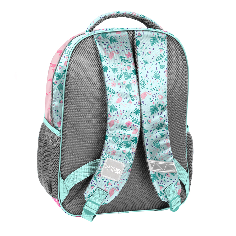 Plecak szkolny Flamingo to produkt, który składa się z dwóch dużych komór, zewnętrznej kieszeni oraz dwóch bocznych kieszonek stworzonych z siatki. Takie kieszonki umożliwiają wygodne przechowywanie bidonu lub butelki. Zastosowane elementy odblaskowe na plecaku poprawiają widoczność dziecka, co wpływa na jego bezpieczeństwo.