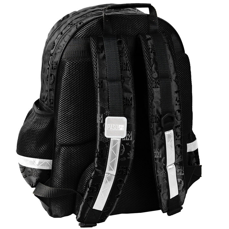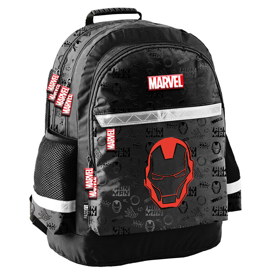 Plecak szkolny Iron Man. Plecak posiada dwie pojemne komory oraz dwie duże kieszenie frontowe. Dodatkowo jest wyposażony w dwie boczne kieszonki z siatki, które doskonale nadają się do przechowywania drobniejszych akcesoriów lub butelki z napojem. Usztywnione gąbką, ergonomiczne wyprofilowane plecy oraz regulowane szelki pokryte miękkim materiałem zapewniają dziecku prawidłową postawę i odciążają kręgosłup. Plecak wyposażony jest w usztywnione dno, wzmocnione i zabezpieczone gumowymi stopkami. Na froncie, bokach i z tyłu posiada elementy odblaskowe, które zwiększają bezpieczeństwo. Uszyty jest z materiału odpornego na przemakanie. Idealnie sprawdzi się zarówno w szkole czy na wycieczce.