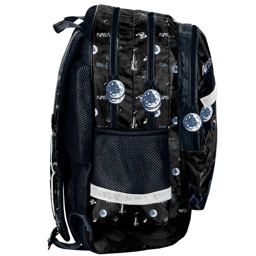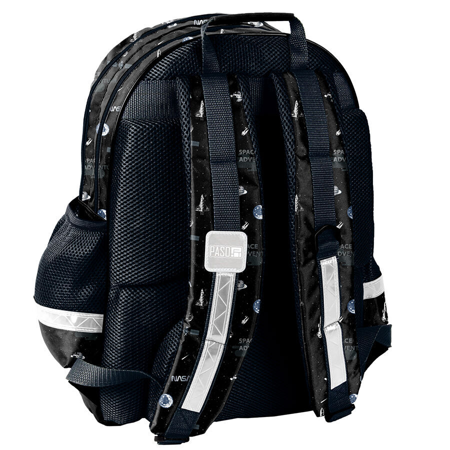 Plecak szkolny w motywie Space adventure NASA charakteryzuje się dwiema pojemnymi komorami oraz dwoma dużymi kieszeniami frontowymi. Dodatkowo, został wyposażony w dwie boczne kieszonki z siatki, które są doskonałym rozwiązaniem do przechowywania mniejszych akcesoriów lub butelki z napojem. Ergonomiczne plecy, usztywnione gąbką, oraz regulowane szelki pokryte miękkim materiałem, zapewniają dziecku prawidłową postawę oraz wspierają właściwe ułożenie kręgosłupa. Plecak posiada usztywnione dno, które zostało wzmocnione i zabezpieczone gumowymi stopkami. Na froncie, bokach oraz z tyłu plecaka znajdują się elementy odblaskowe, co znacząco podnosi poziom bezpieczeństwa jego użytkowania. Materiał, z którego został uszyty, jest odporny na przemakanie, co czyni go idealnym zarówno do użytku w szkole, jak i na wycieczkach.