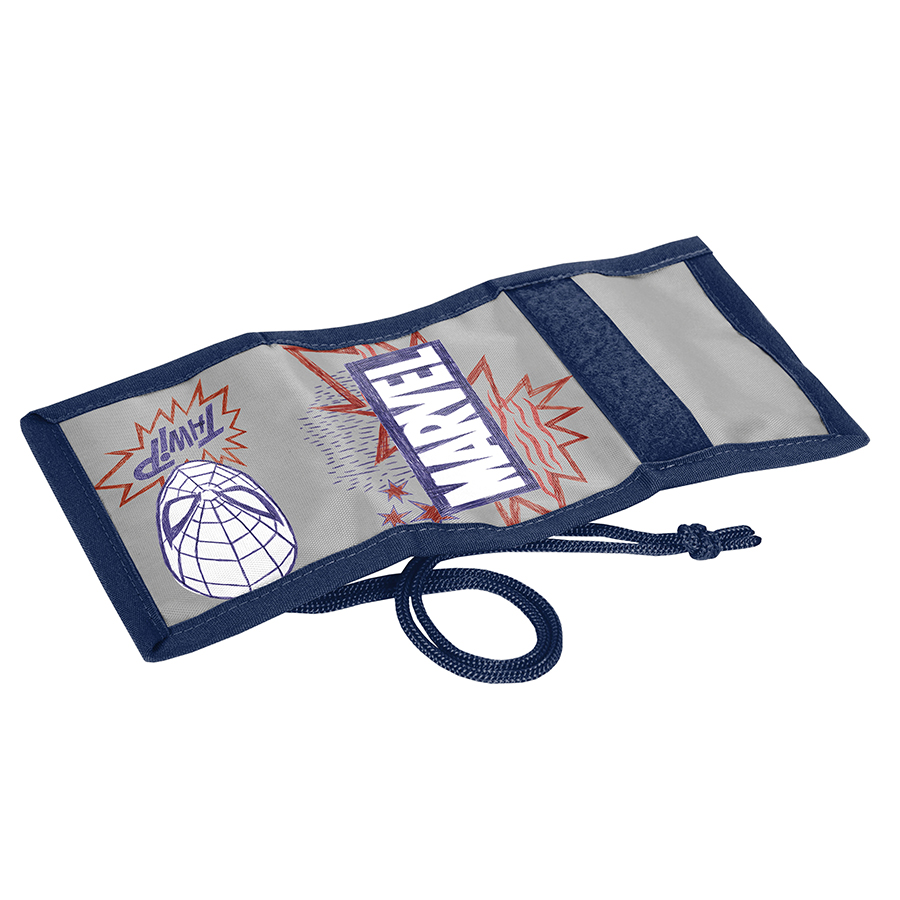 Portfel Spider-Man ze sznurkiem. Portfel posiada wiele funkcjonalnych przegród zapewniających dobrą organizację. Wewnątrz kieszonka na zamek na monety oraz przeźroczysta kieszonka na małe zdjęcie. Obszerna kieszeń przez całą długość rozłożonego na płasko portfela mieści papierowe banknoty, a dwie dodatkowe przegrody mogą przydać się do przechowywania różnych informacji. Model wyposażony został w sznureczek umożliwiający zawieszenie lub przymocowanie produktu.
