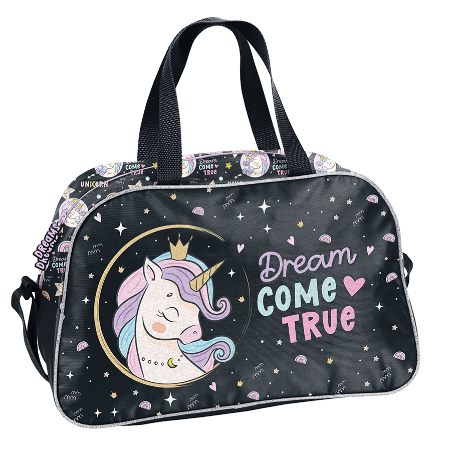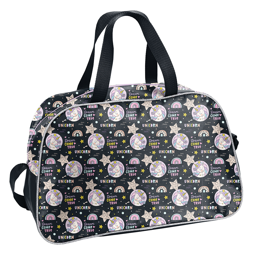 Torba sportowa Jednorożec. Idealna na basen i inne zajęcia sportowe. Świetnie sprawdzi się również podczas wyjazdów weekendowych czy wakacyjnych. Torba posiada jedną pojemną komorę, zapinaną na zamek dwukierunkowy z ozdobnym pullerem. Model wyposażony został w usztywniane dno, dwa wygodne uchwyty do przenoszenia oraz regulowany pasek na ramię o wymiarach min. 60 cm oraz max. 120 cm.