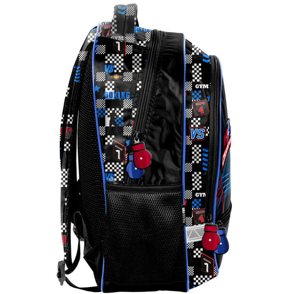 Plecak szkolny Boxing club o tematyce sportowej jest produktem składającym się z dwóch przestronnych komór, przedniej kieszeni oraz dwóch bocznych