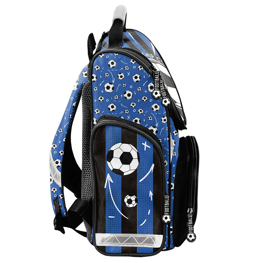 Tornister szkolny Championship cup football charakteryzuje się jedną obszerną komorą, która jest zapinana na dwukierunkowy zamek, wyposażony w ozdobne pullery ułatwiające jego zamykanie. Wnętrze tornistra zawiera przegrody, które umożliwiają dziecku utrzymanie porządku wśród przechowywanych przedmiotów. Na przedniej części tornistra znajduje się funkcjonalna kieszeń, zapinana na zamek. Po bokach tornistra umieszczono dwie kieszonki: jedna z siatki, idealna do przechowywania bidonu lub butelki, a druga zapinana na zamek. Ergonomicznie ukształtowane, sztywne plecy stanowią wsparcie dla kręgosłupa młodego użytkownika. Miękkie, regulowane oraz wyprofilowane szelki zapewniają prawidłową i zdrową postawę ciała dziecka. Tornister wyposażony jest w usztywniony spód oraz elementy odblaskowe, co zwiększa jego funkcjonalność i bezpieczeństwo.