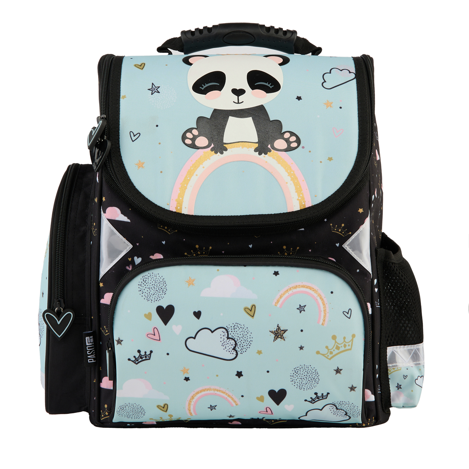 Tornister szkolny Panda. Posiada jedną obszerną komorę, zapinaną na zamek dwukierunkowy z ozdobnymi pullerami ułatwiającymi zamykanie. Wewnątrz znajdują się przegrody, które pomogą dziecku utrzymać stały porządek wśród zapakowanych przedmiotów. Na przodzie tornistra funkcjonalna, zapinana na zamek kieszeń. Po bokach dwie kieszonki, jedna z siatki idealna na bidon lub butelkę, druga zapinana na zamek. Ergonomicznie ukształtowane, sztywne plecy w odczuwalny sposób odciążają kręgosłup małego właściciela. Miękkie, regulowane i wyprofilowane szelki odpowiadają za właściwą i zdrową posturę Twojego dziecka. Tornister posiada usztywniony spód oraz elementy odblaskowe.