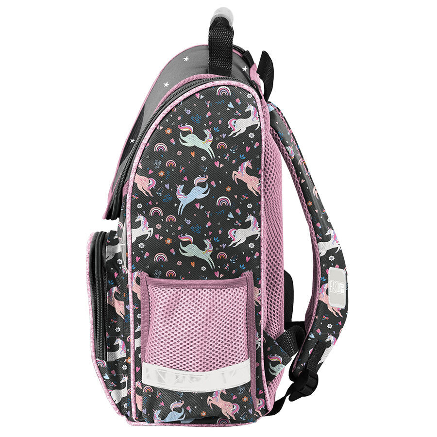 Z przodu tornistra znajduje się praktyczna kieszeń zapinana na zamek, a po bokach umieszczono dwie dodatkowe kieszonki – jedna siatkowa, idealna na bidon lub butelkę, a druga zamykana na zamek. Ergonomicznie ukształtowane, sztywne plecy skutecznie odciążają kręgosłup małego właściciela.